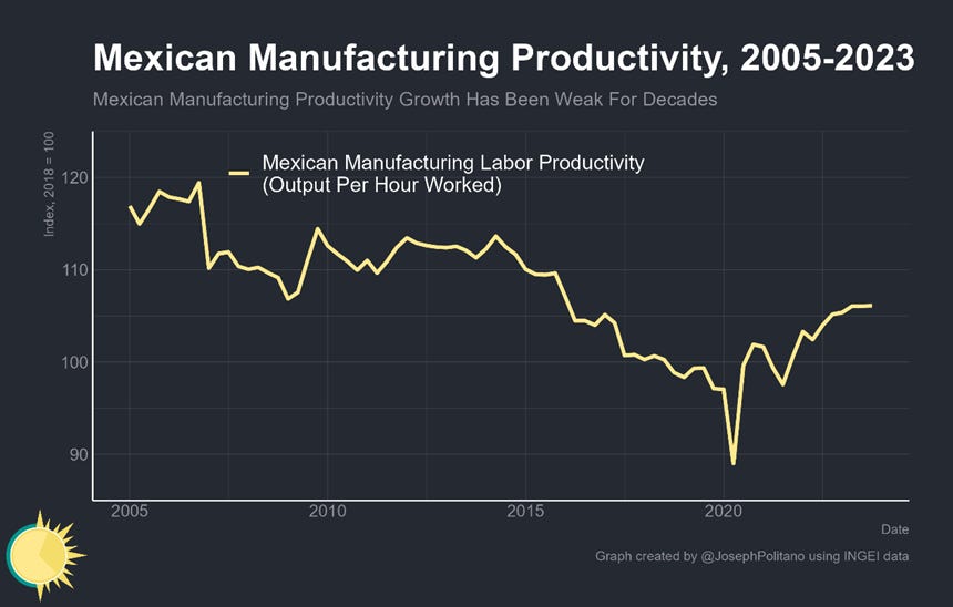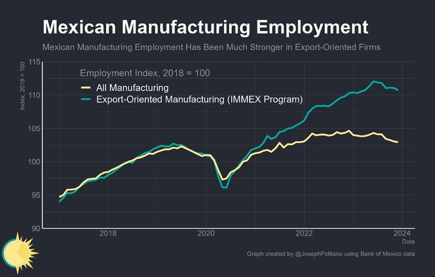 But even under low productivity the Mexican manufacturing employment, while relatively weak overall, has been strongest in the export-oriented businesses that now make up roughly 60% of manufacturing jobs. Since 2018, employment in manufacturers who participate in the IMMEX program has risen by more than 10% while total manufacturing employment has risen by less than 3%.