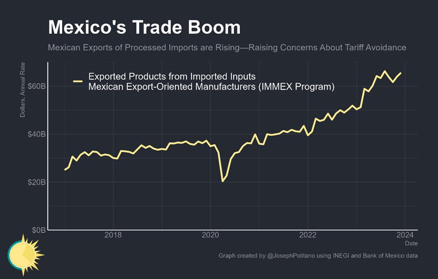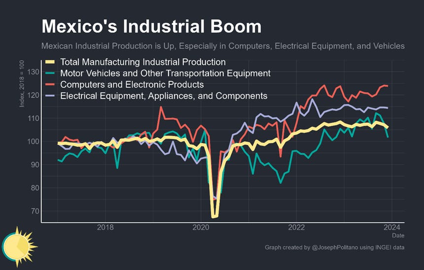 Yet on the top of it, it is still true that the majority of Mexico’s export boom is genuine—most tariff avoidance would go through countries elsewhere in Asia and many of the sources of rising Mexican exports are in industries where China has little presence in the North American market, like motor vehicles. It is also obvious when you look at Mexican manufacturing output—overall production has risen by 5% since 2018 but has been even stronger in export-oriented industries—Computer output is up nearly 25%, appliance and electrical equipment output is up 15%, and motor vehicle production has more than recovered from the effects of the semiconductor shortage. The value added data about Mexican industry also confirms this conclusion because only the manufacture of parts for motor vehicles could directly be connected with Chinese stuff re-export: