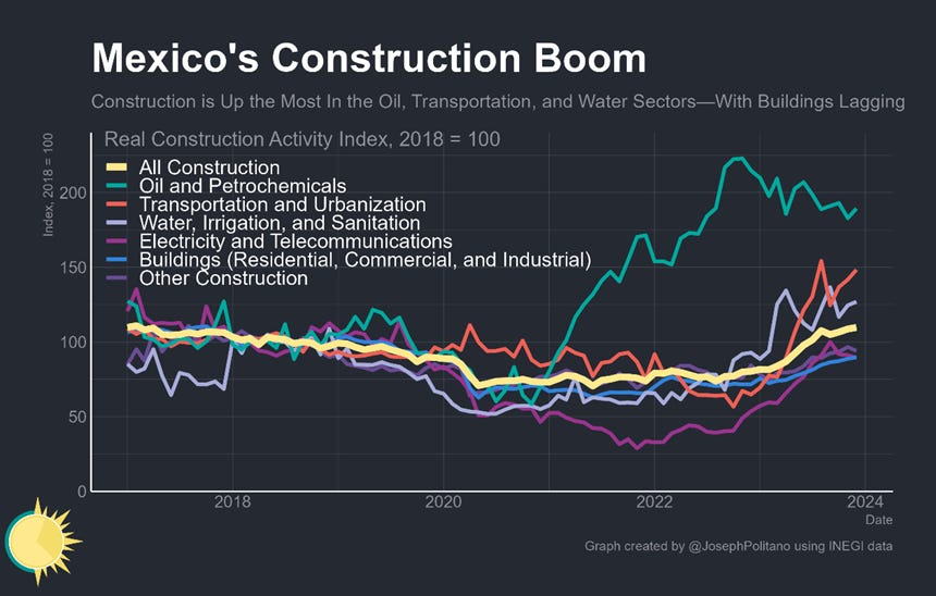 Thanks to Dos Bocas, Tren Maya, and CIIT, real construction activity in the oil and petrochemical sector has doubled compared to 2018 while real construction in the transportation and urbanization sector has increased by nearly 50%. These megaprojects by no means represent the entirety of the public works push either—real investments in electricity, telecommunication, and water infrastructure have also risen significantly over the last year. In contrast, overall construction of buildings has been relatively low, held back by an extremely weak residential sector that has still not recovered from COVID.