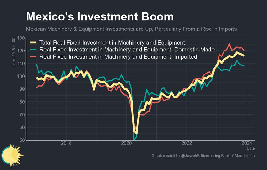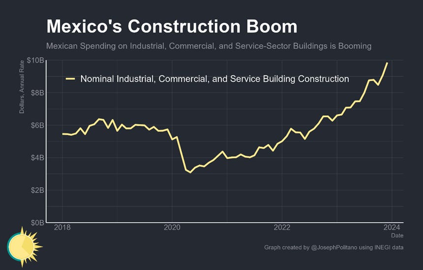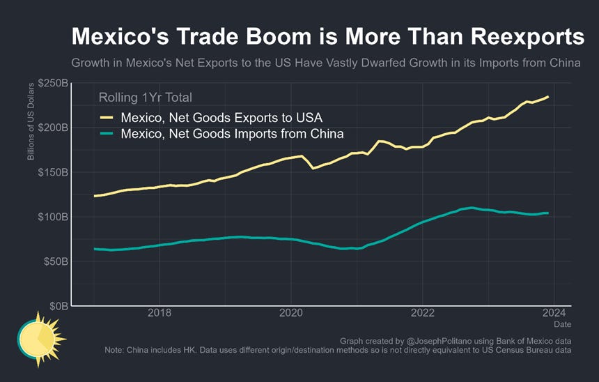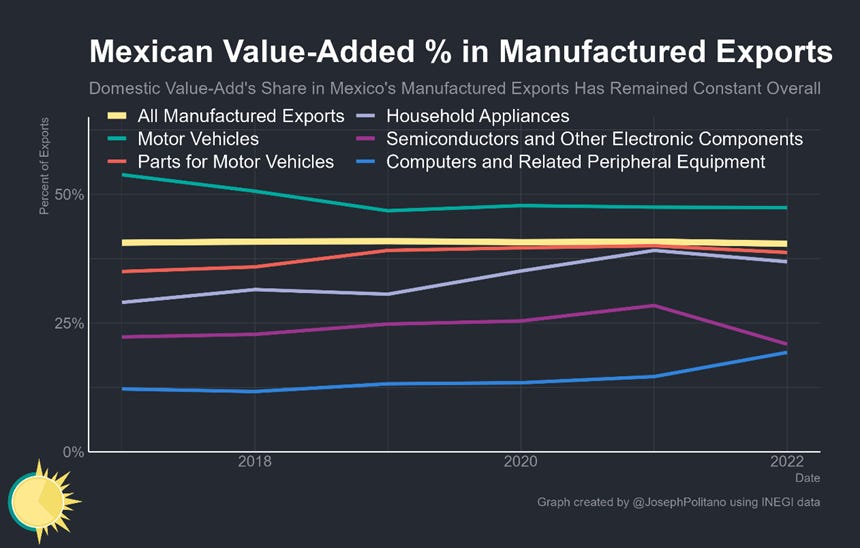 But even so, what happens in the Mexican industry has already been paying dividends—Mexico’s northbound net goods exports closed out last year above $225B, a record high despite the country’s increasing imports of American natural gas and other energy products. Of course, the great fear is that Mexican factories are used only for small amounts of packaging and final assembly activity to circumvent tariffs on what are still fundamentally Chinese goods—but so far, that fear has been largely unfounded. Mexico’s net imports from China have grown by significantly less than its net exports to the US, and much of Mexico’s rising imports reflect strong domestic spending on consumer goods and equipment rather than intermediate inputs. Indeed, Mexico’s overall share of value-added in its manufacturing exports has remained relatively constant over the last 5 years even amidst the near-shoring boom. In other words, Mexico is already benefitting from more active US industrial policy and has a chance to become an even larger presence in American markets—if it can play its cards right.